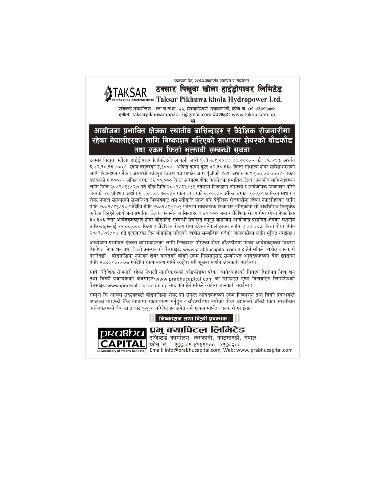 ISSUE CLOSE NOTICE OF LOCAL SHARE_TAKSAR PIKHUWA KHOLA HYDROPOWER LTD